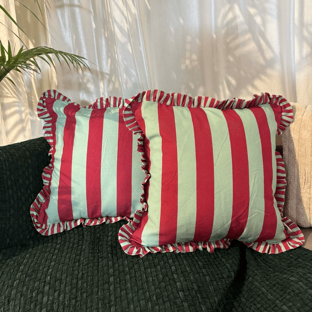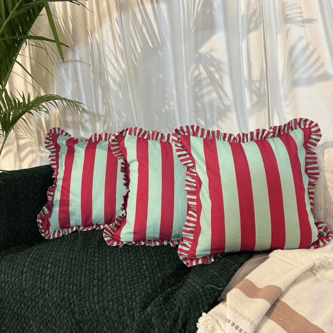 Candy Cane Ruffle Cushion Cover – Green & Maroon