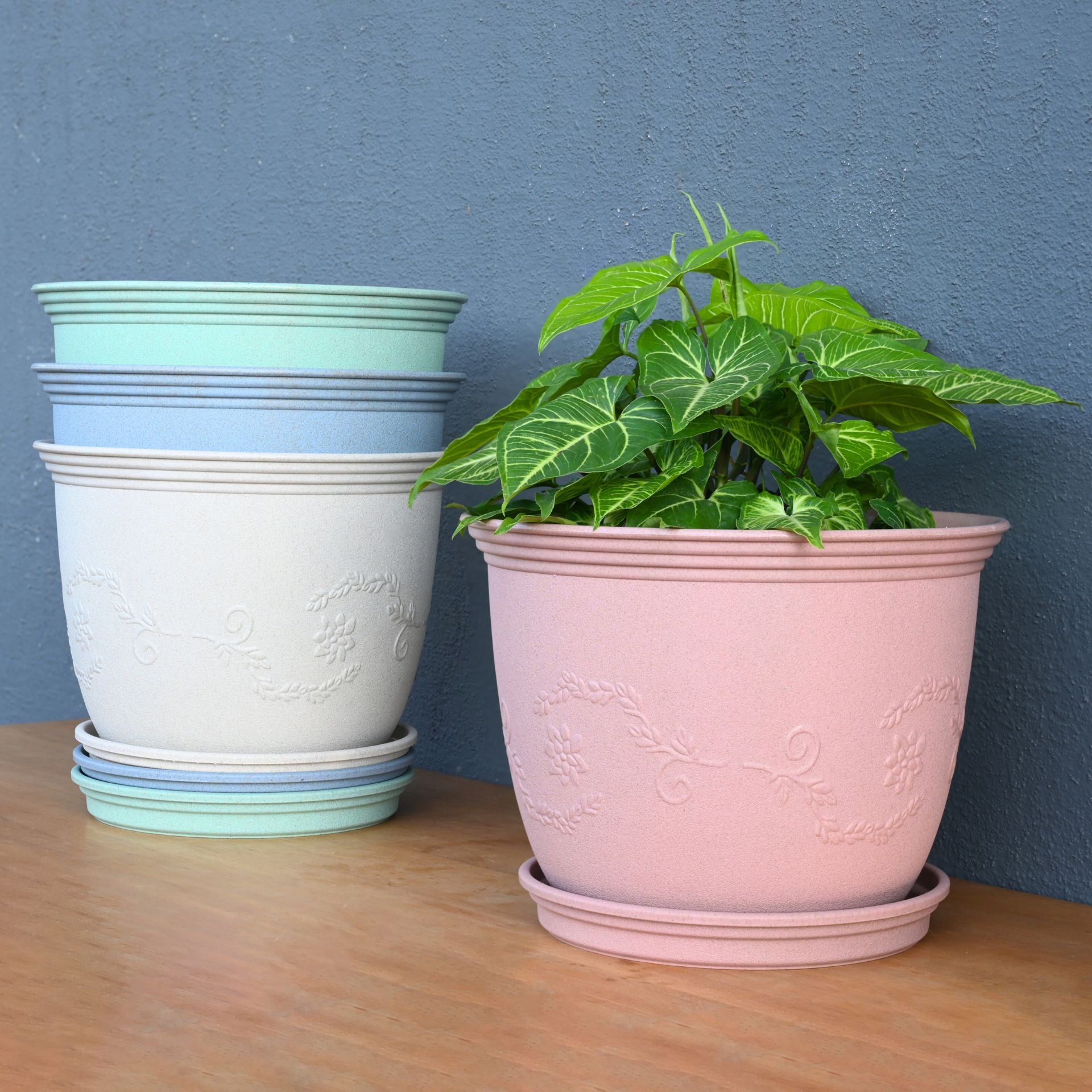 Earth-Friendly Planters Leafy 12 Inch set of 4 | Bamboo Based Pots and Planters with tray