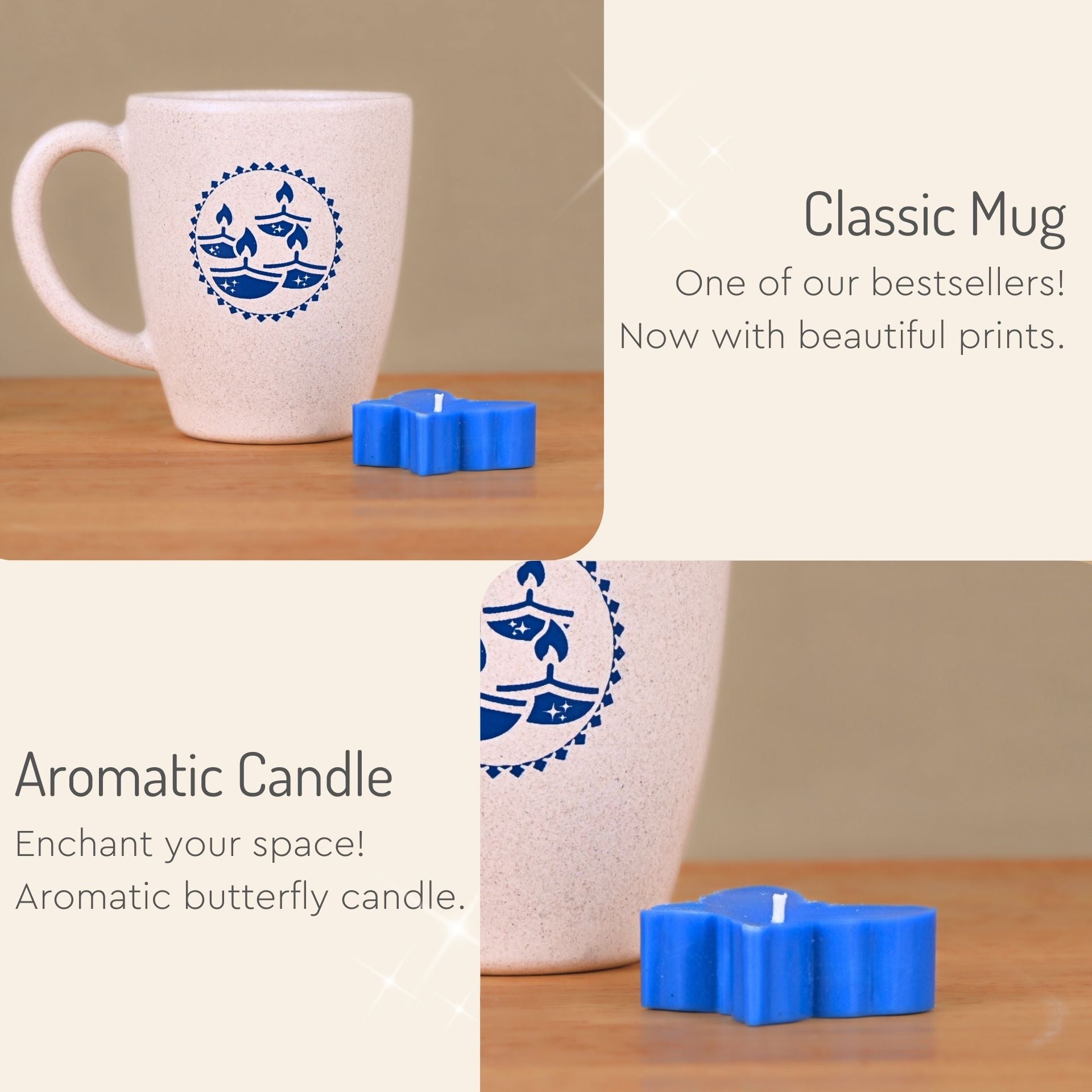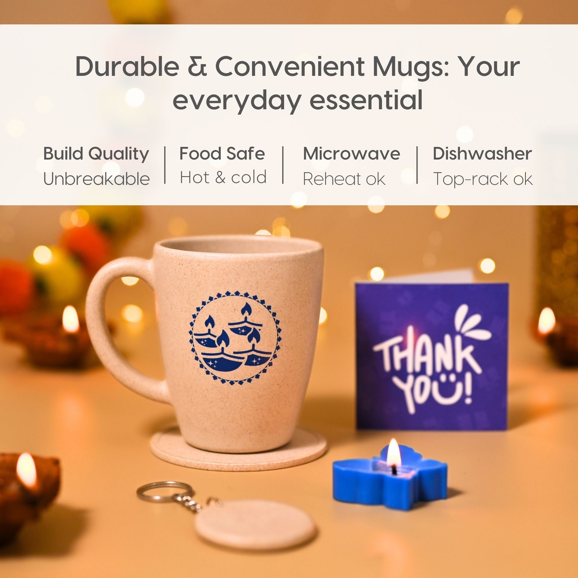 Eha Earth Friendly Diwali Gift Hampers | Diya Printed Mug, Coaster, Key Chain, Candle, Gift Bag, Card