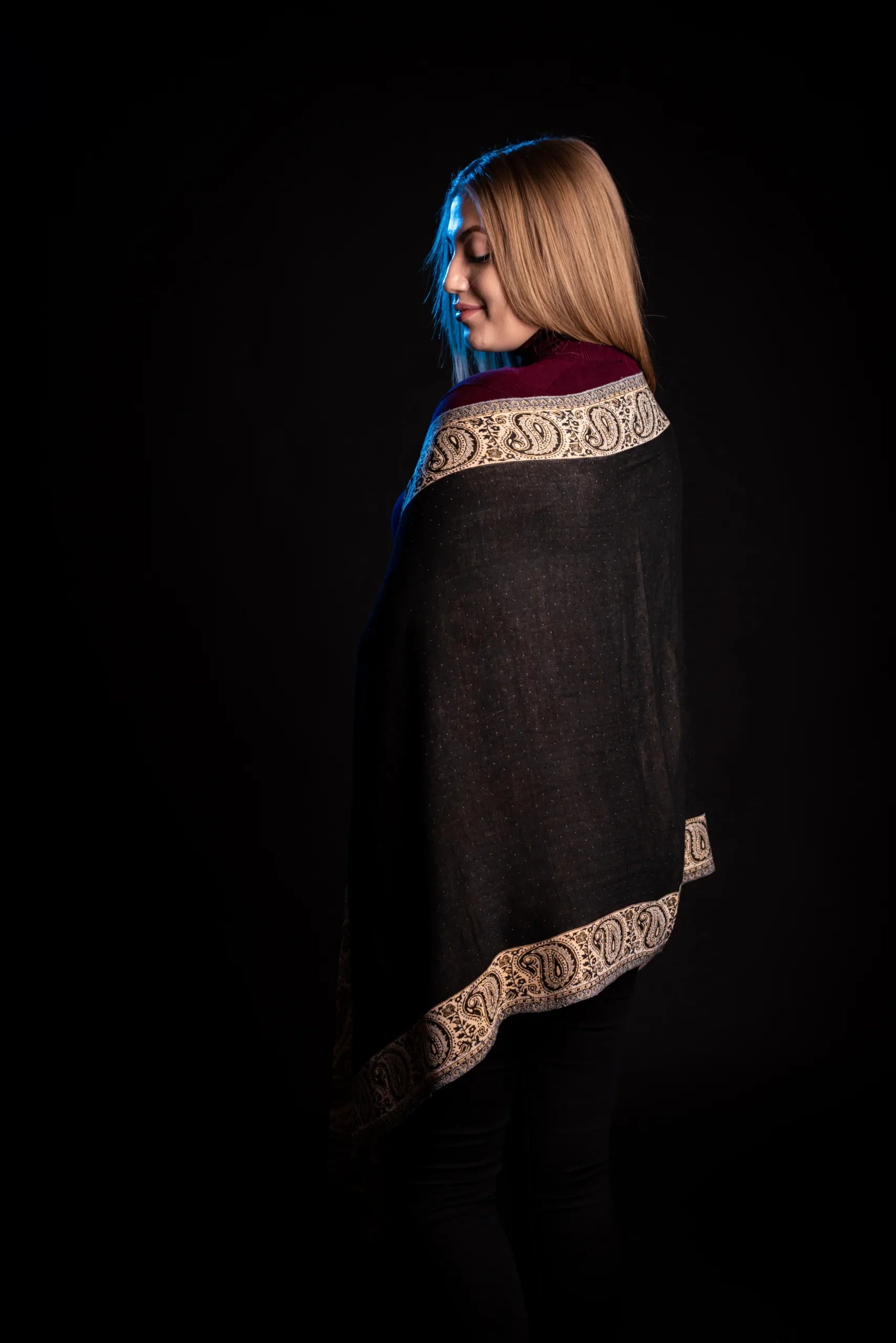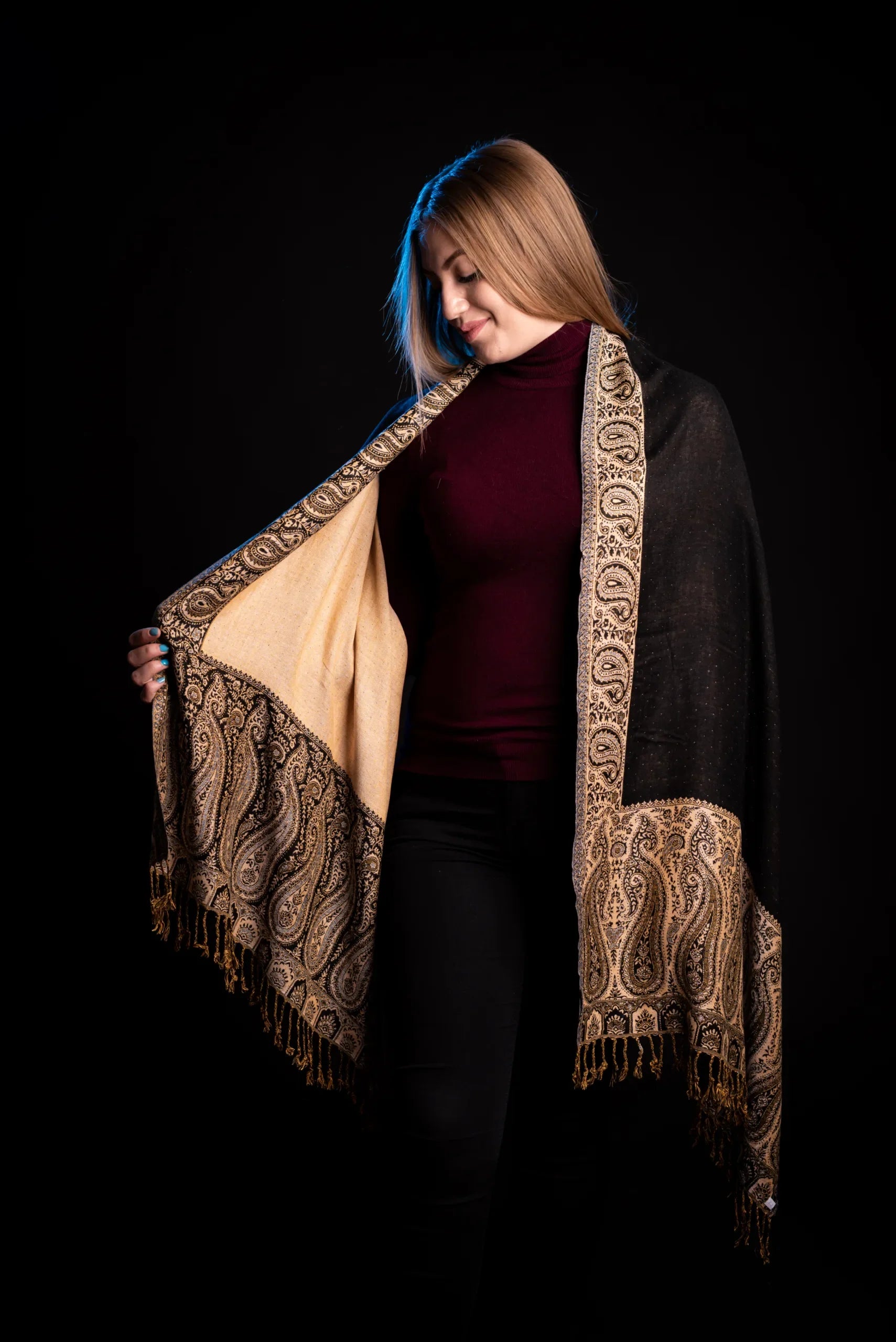 Eșarfă Cașmir reversibilă Paisley negru-bej oriental floral India
