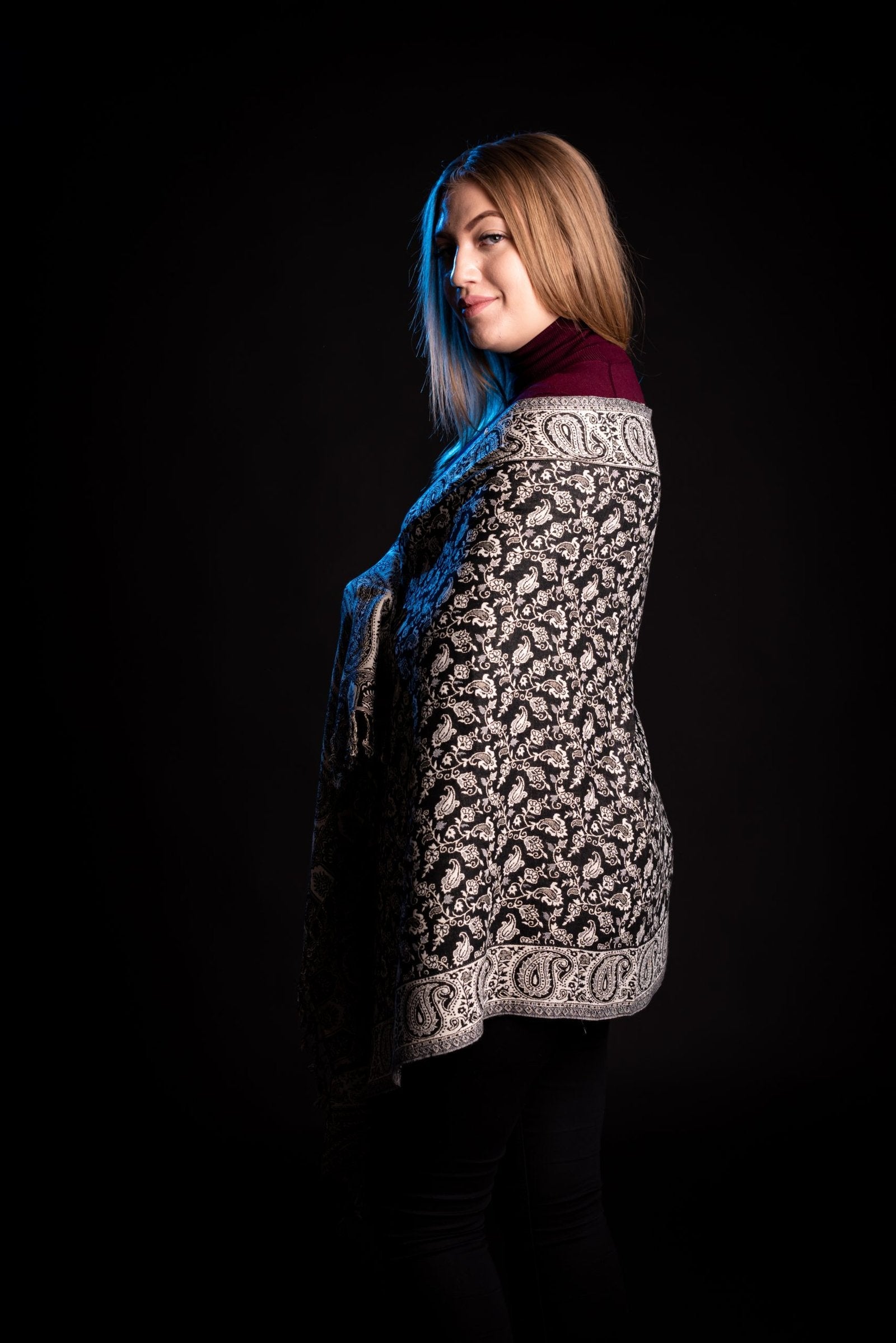 Esarfa Casmir reversibila Paisley oriental floral India, alb-negru