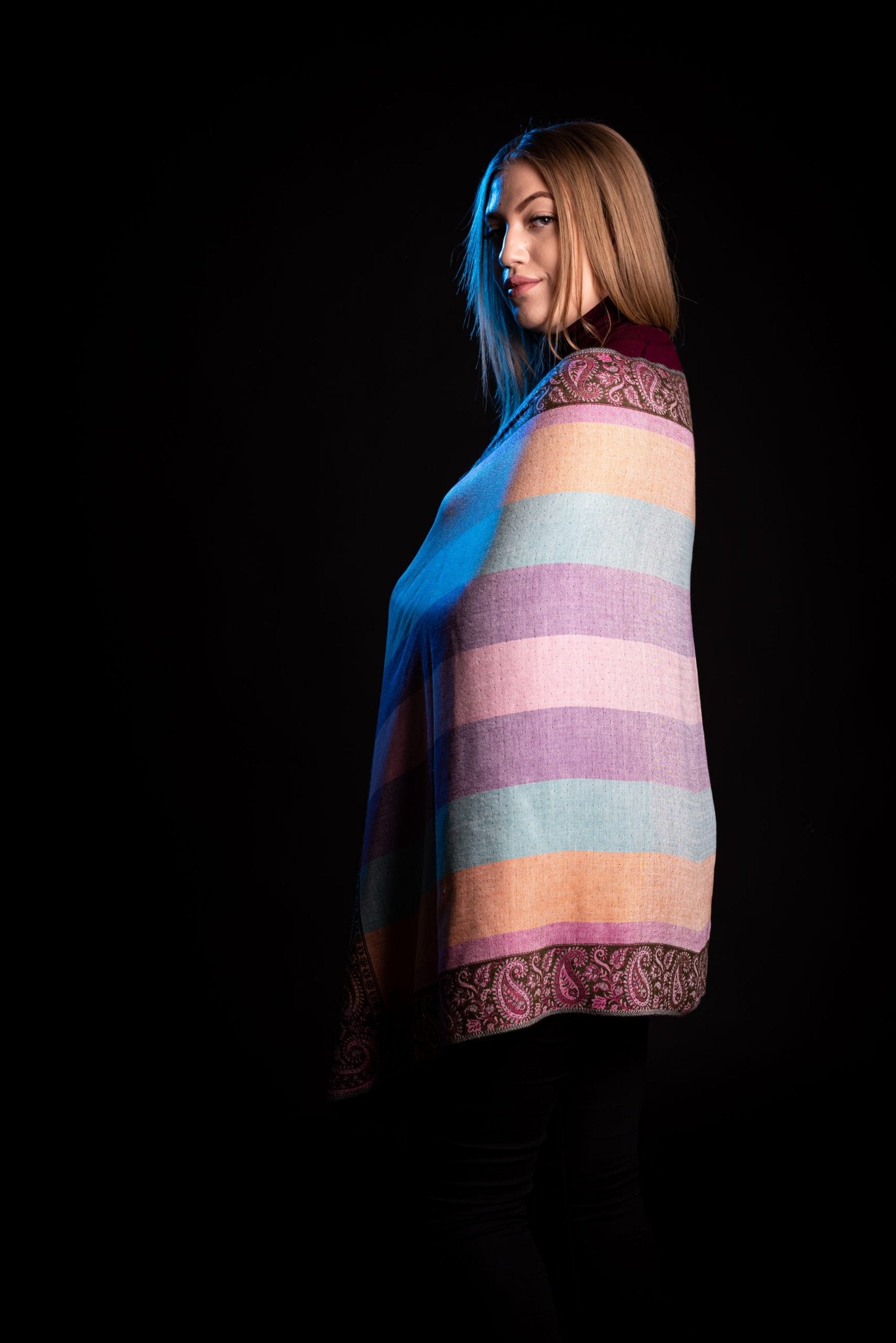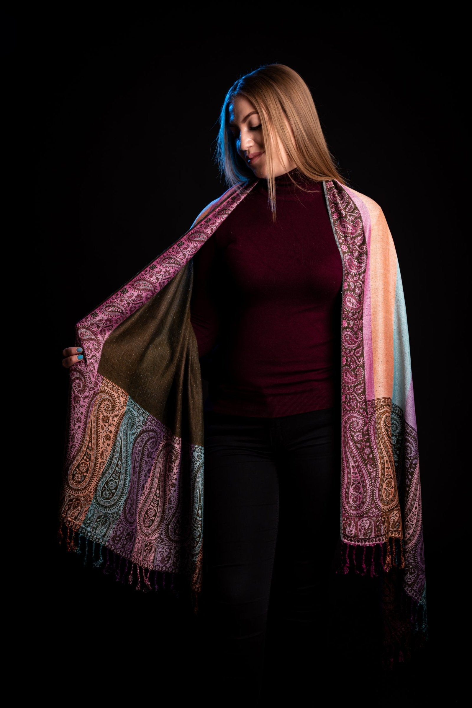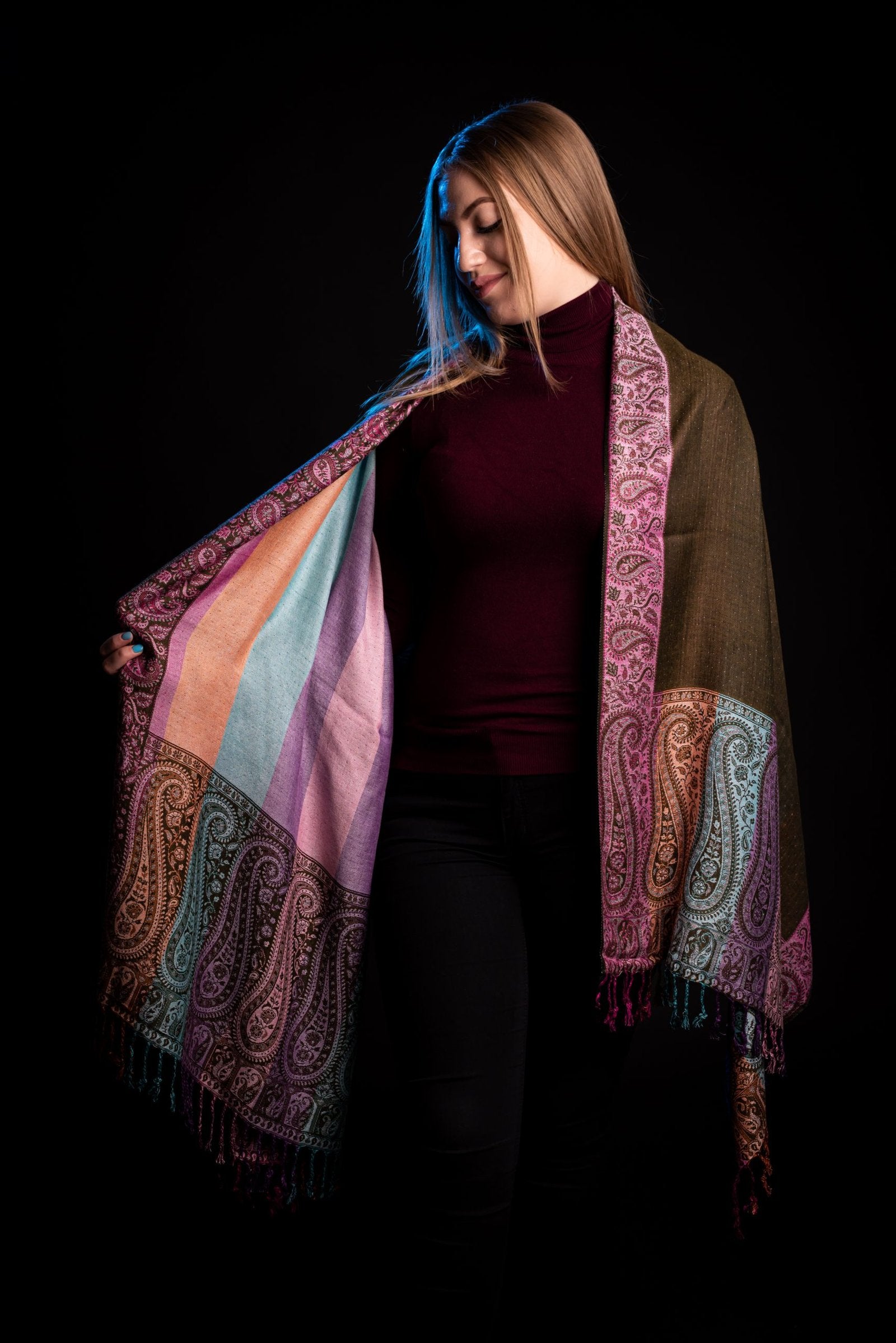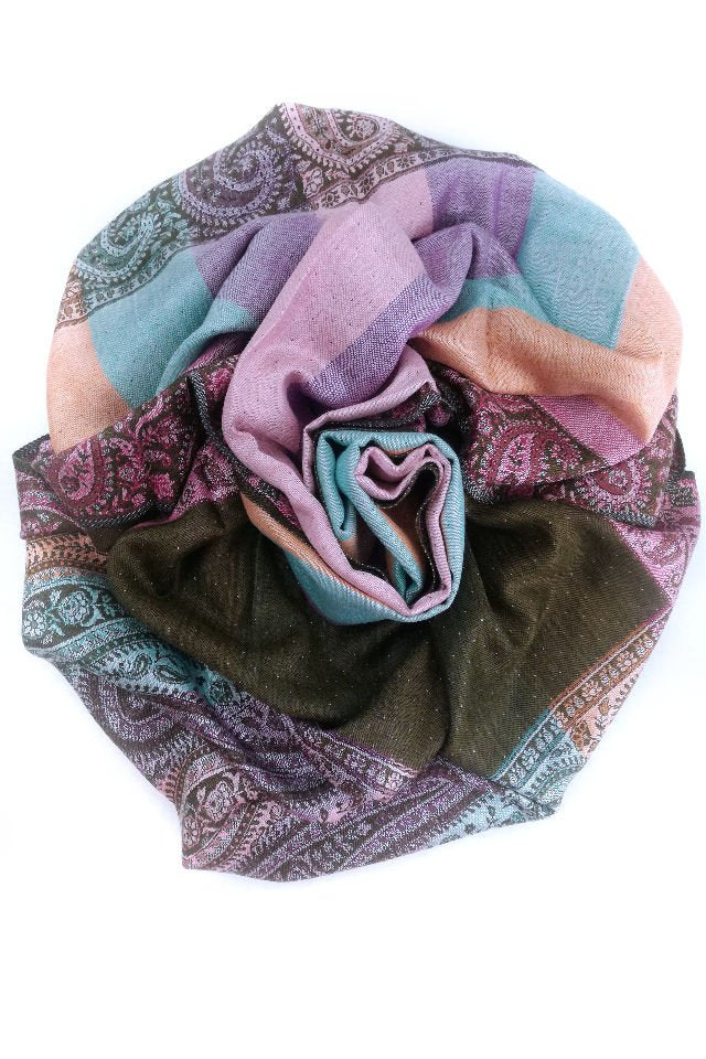 Eșarfă Cașmir reversibilă verde kaki Paisley oriental floral India