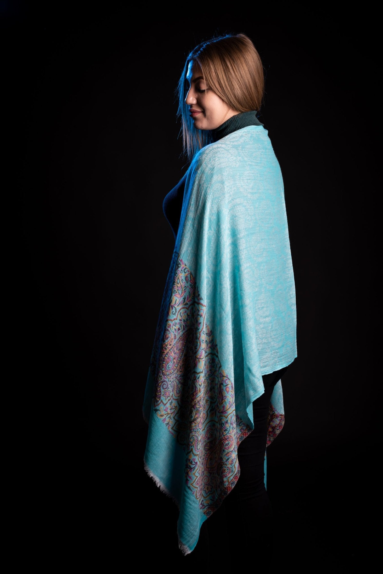 Esarfa-Sal Cara, din Lana Pashmina turcoaz cu broderie fina