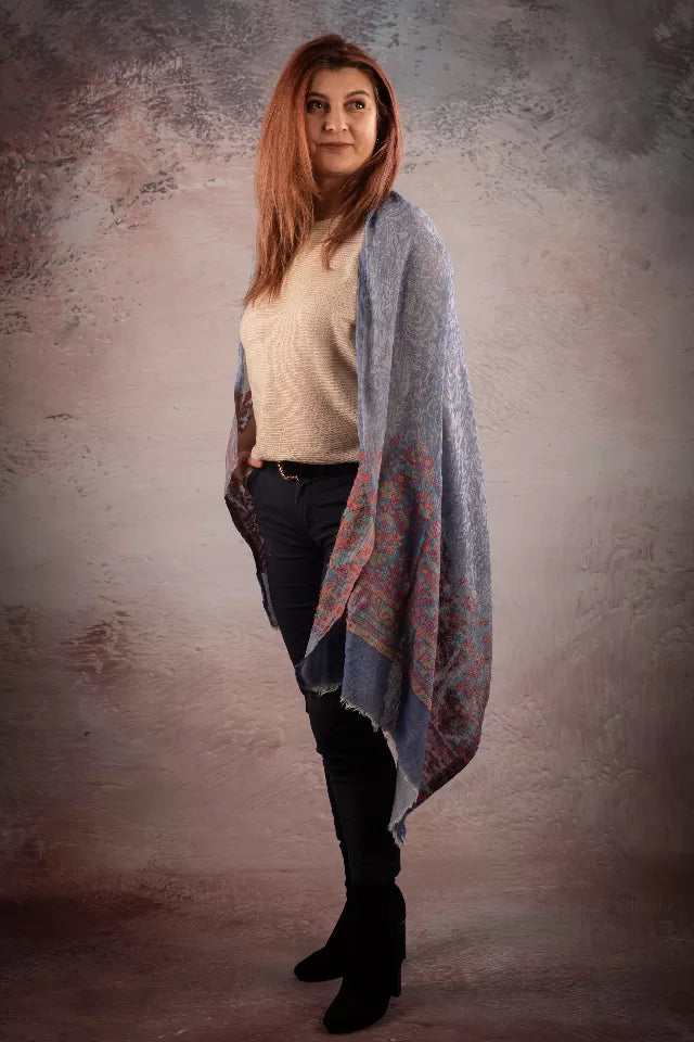 Esarfa-sal din lana pashmina bleo cu broderie fina