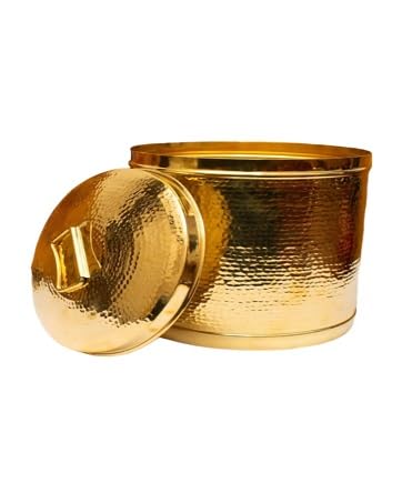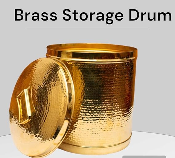 - BRASS ELEGANCE: This traditional brass drum is made from brass exudes a charm with its gold plated finish adding an elegant touch to your kitchen. It's a stunning container designed to store your rice, wheat flour, grains, pulses while adding an exquisite touch of heritage to your kitchen.