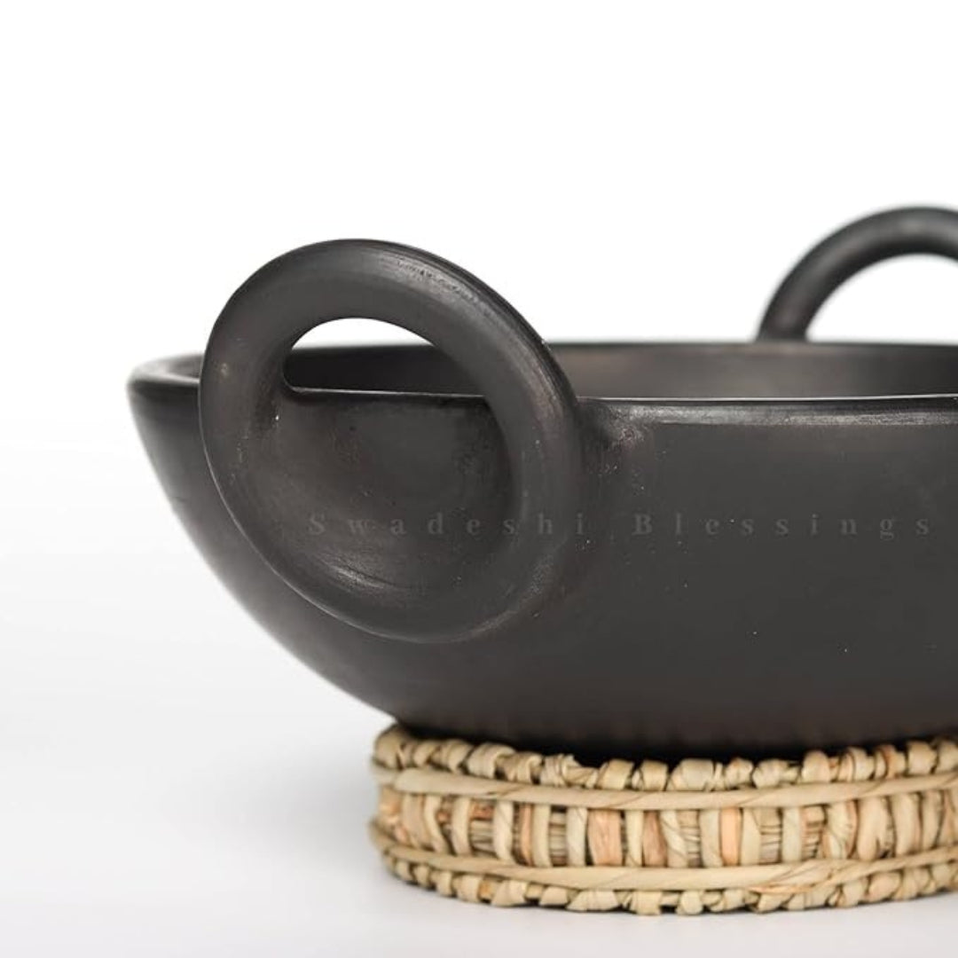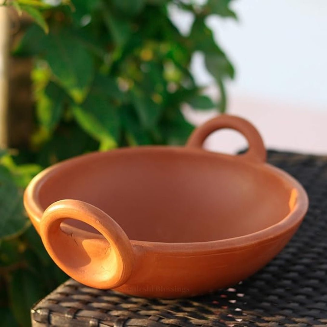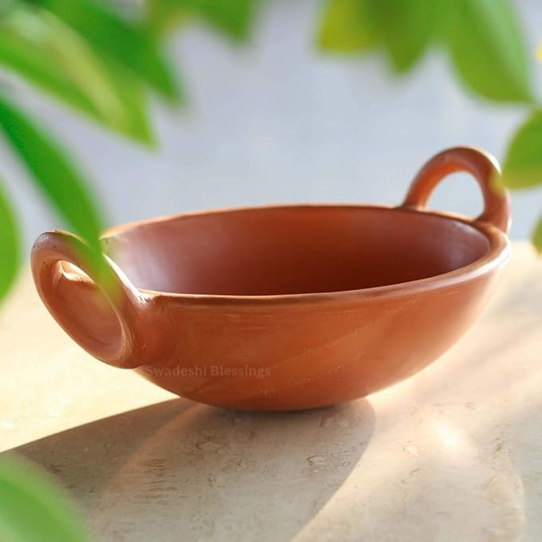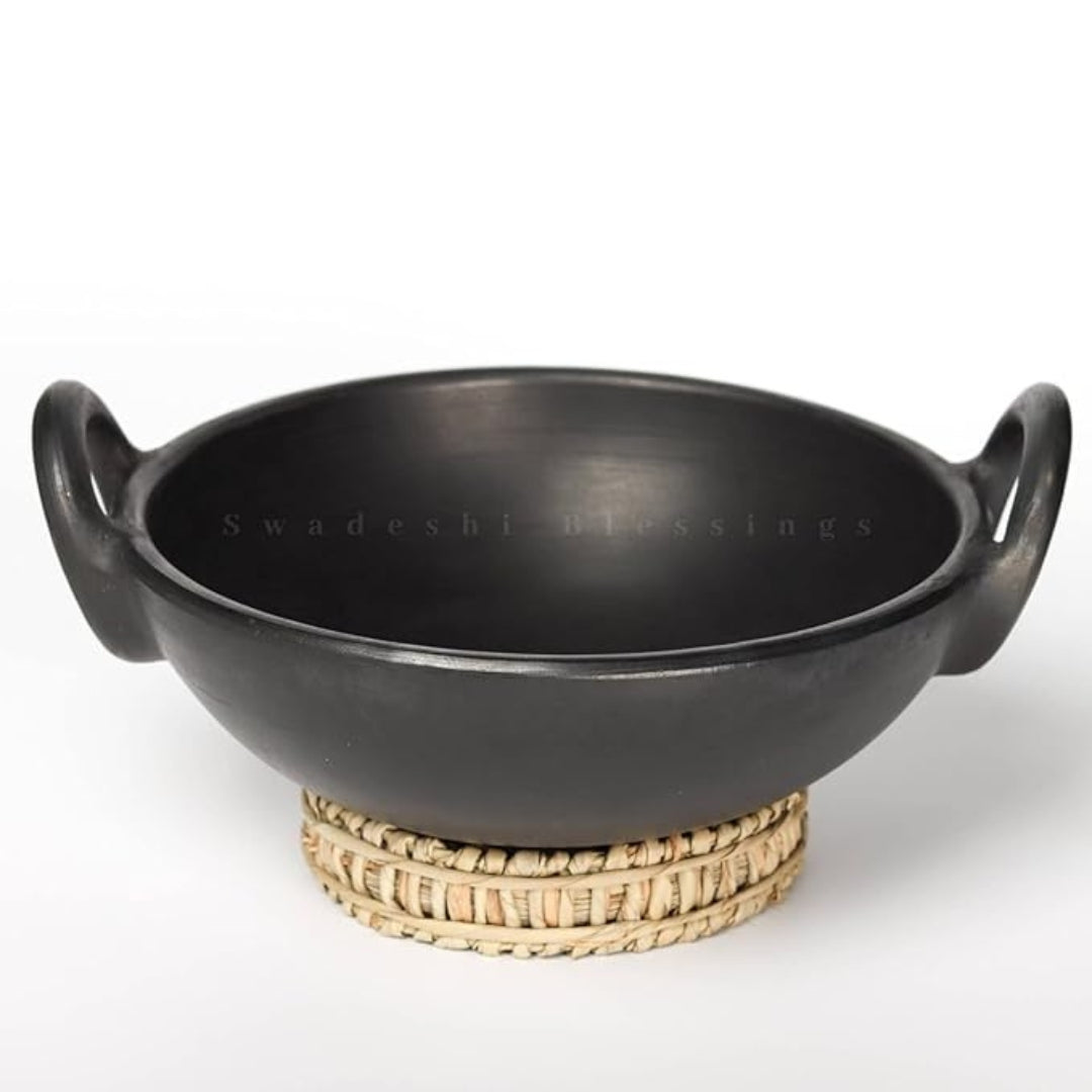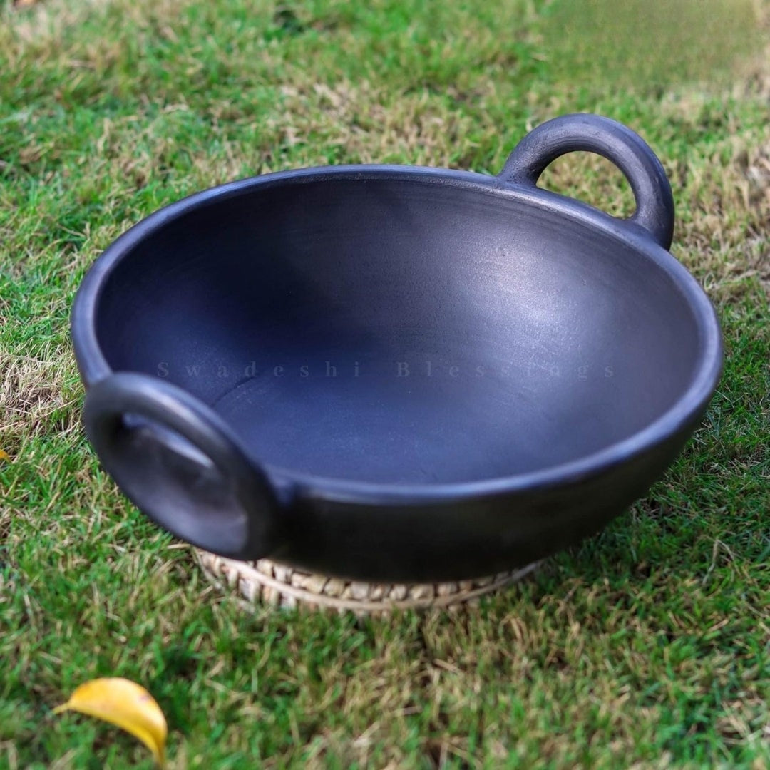 Unglazed Clay Handi / Earthen Kadai / Clay Kadai Combo for Cooking & Serving – 1.8L Black & 1.8L Red (Natural Firing Shade & Mirror Shine) + FREE Ash for Cleaning